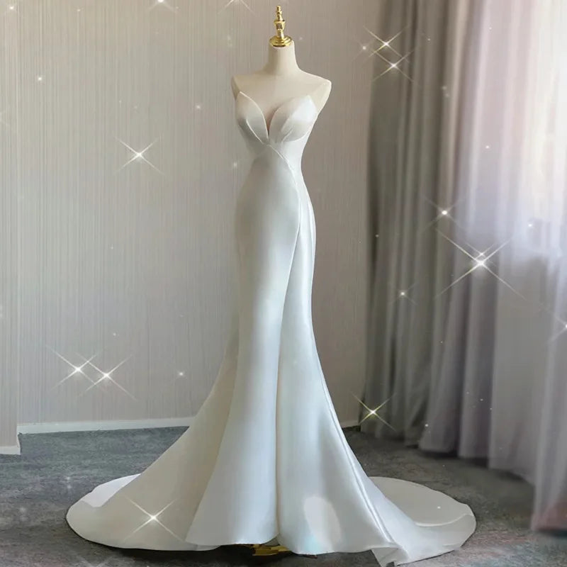 Luxury White Satin Wedding Trailing Mermaid Maxi Dresses