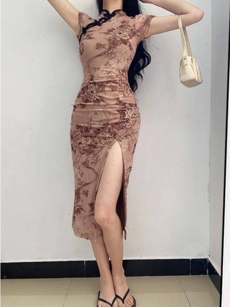 WOMENGAGA Retro Cheongsam Summer High Slim Elegant Flower