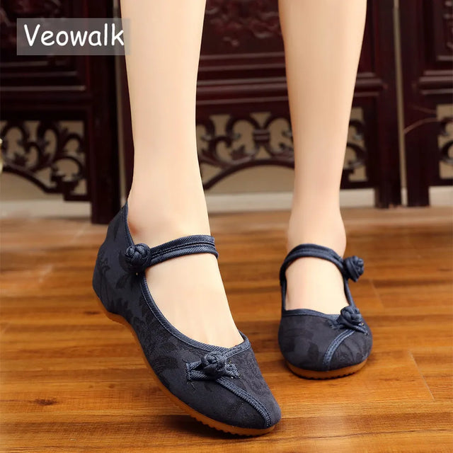 Veowalk Chinese Style Women Jacquard Cotton Fabric Embroidered Ballet Flats Elegant Ladies Casual Comfort Canvas Walking Shoes