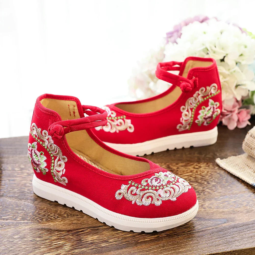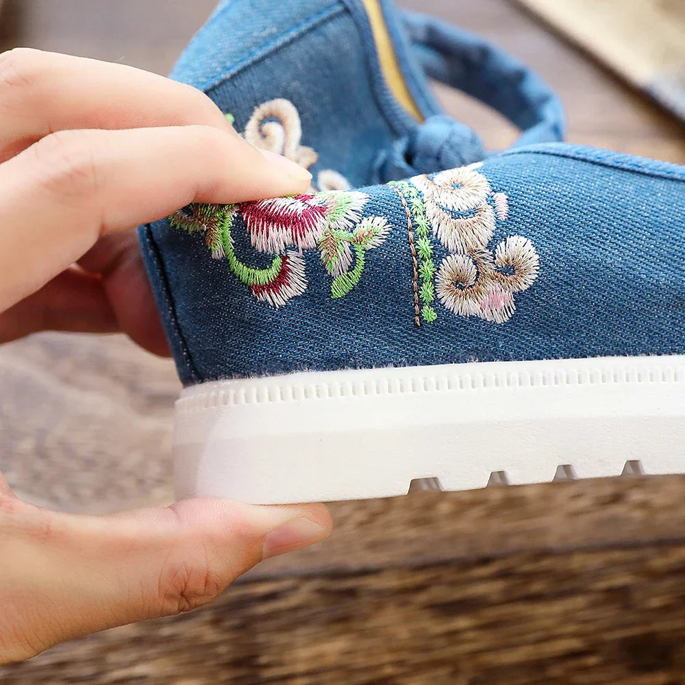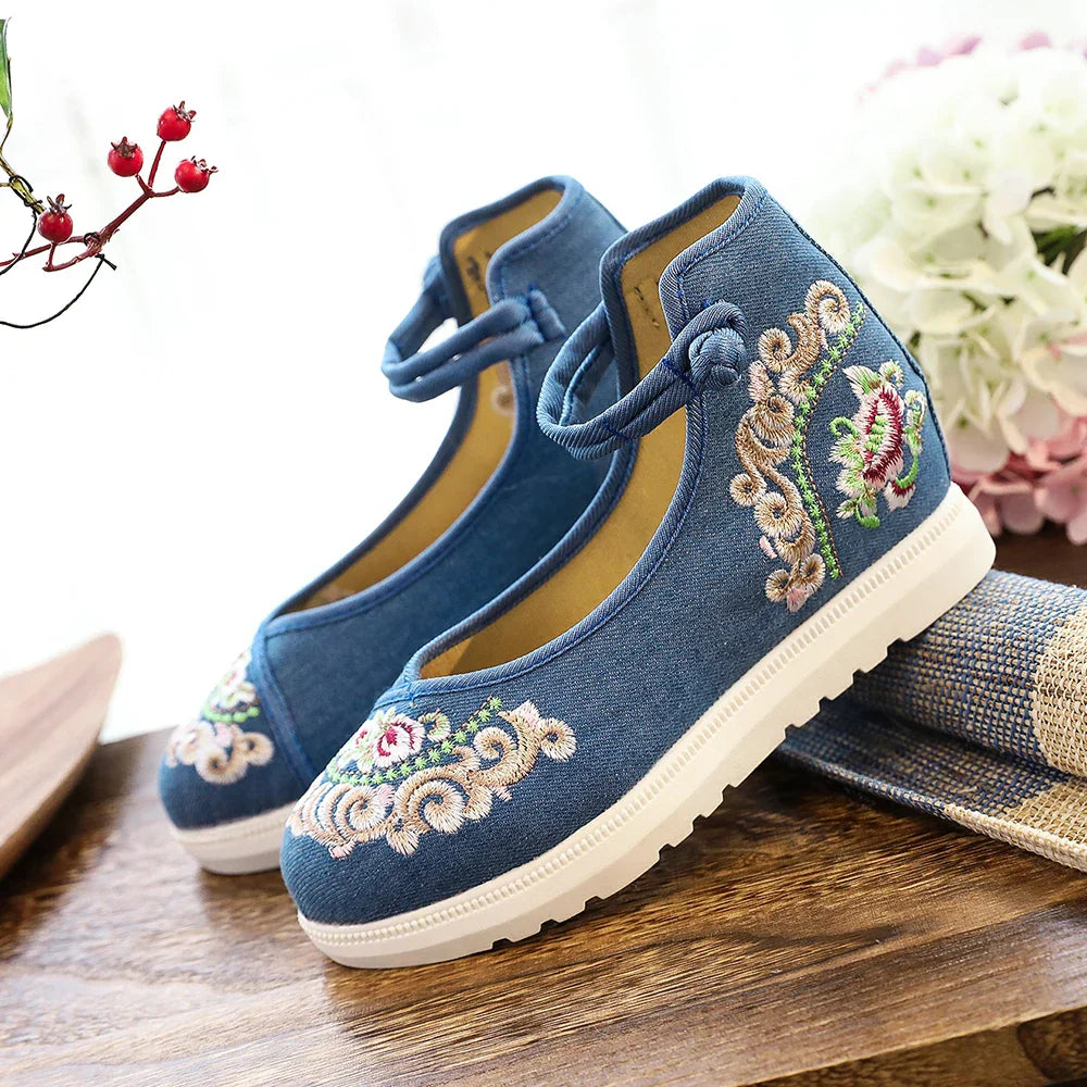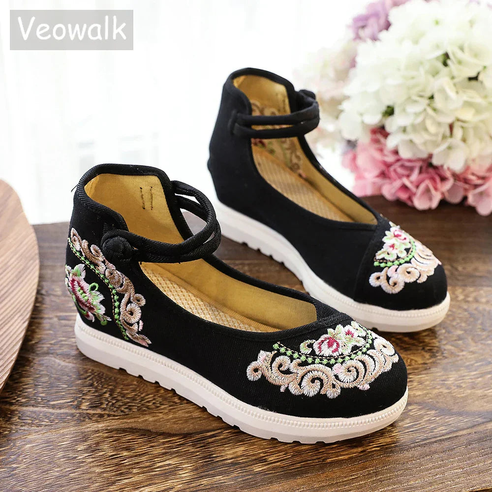 Veowalk High End Floral Embroidered Women Canvas Flat Platforms Mid Top Ankle Strap Chinese Style Ladies Casual Denim Shoes
