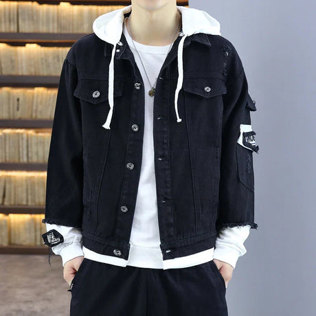 Men's Casual Washed Denim Jacket Streetwear Ripped Stand