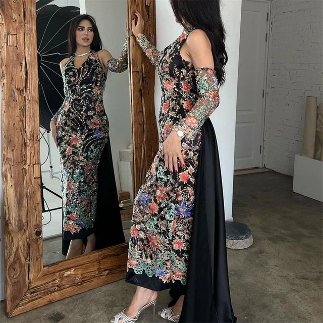Halter Neck Sheath 2023 Women Muslim فستان سهرة فساتين سهره Beads 3D Flowers Tulle Formal Occasion Evening Gown