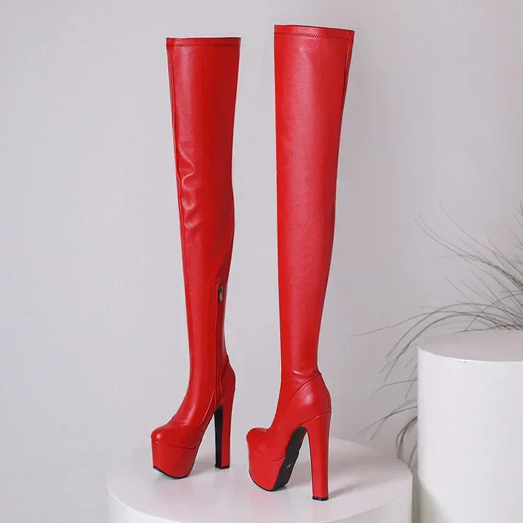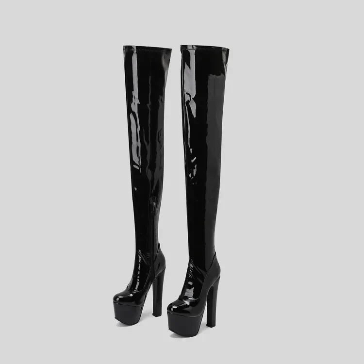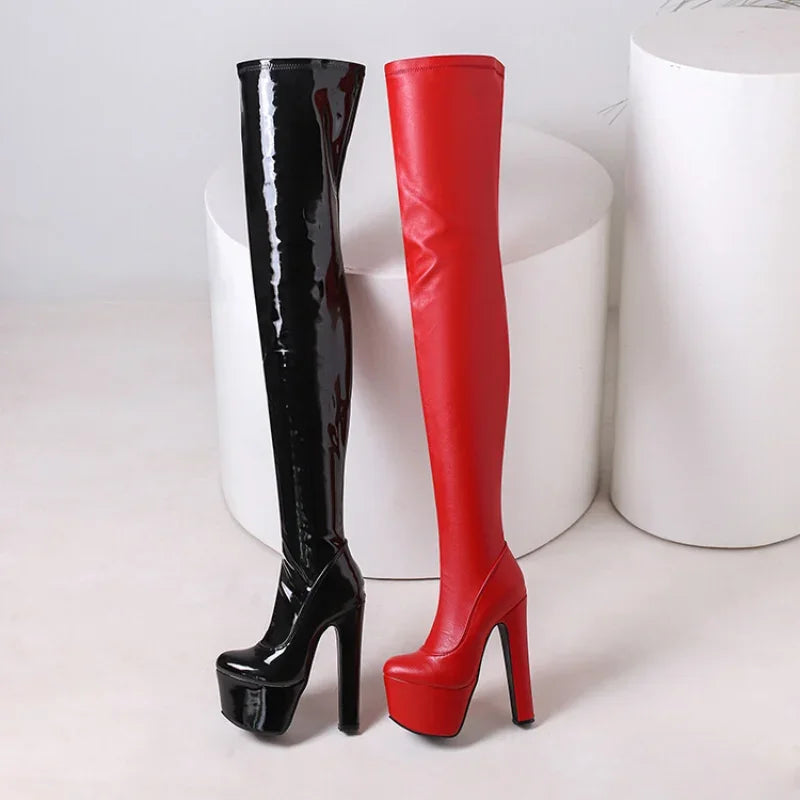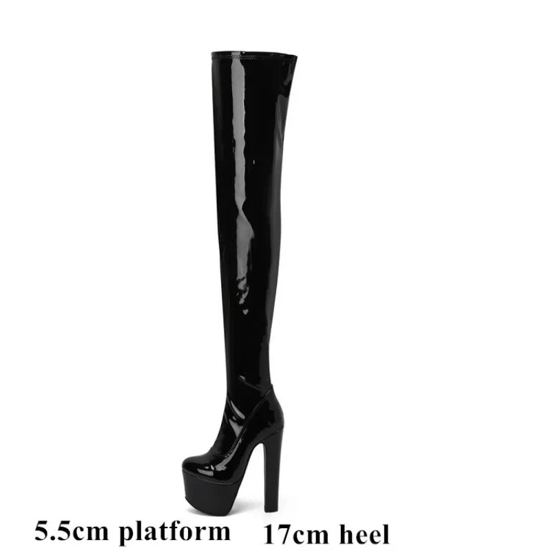 Ochanmeb 17cm Ultra High Heel Thigh Boots Women Stretch Patent Leather Bright Red Zipper Over-the-Knee Crotch Boot Platform Shoe