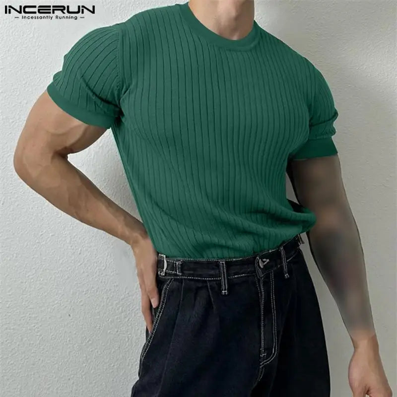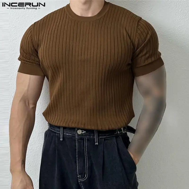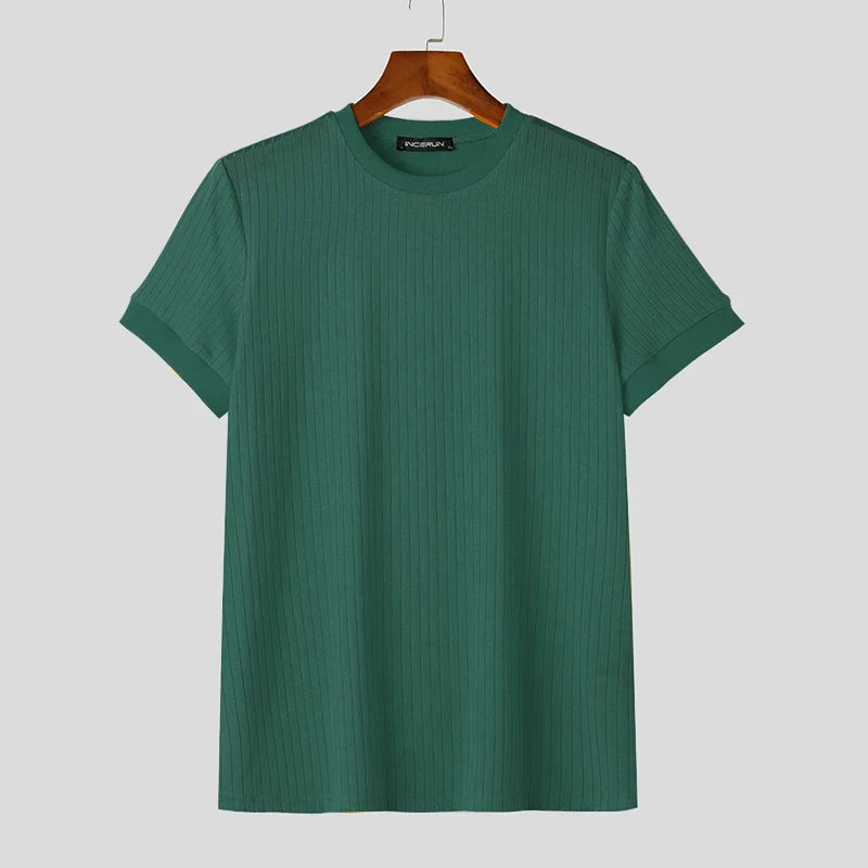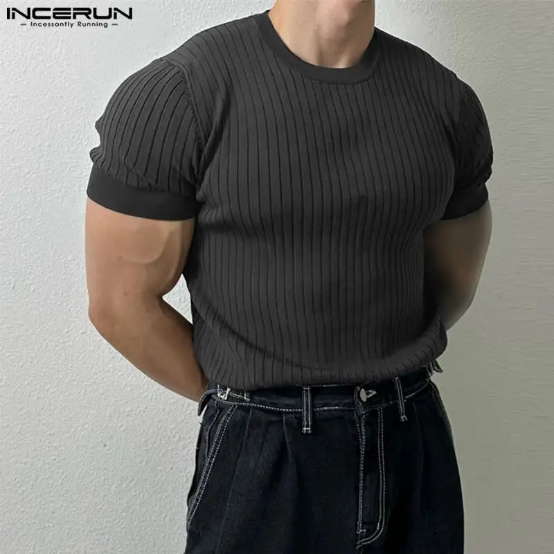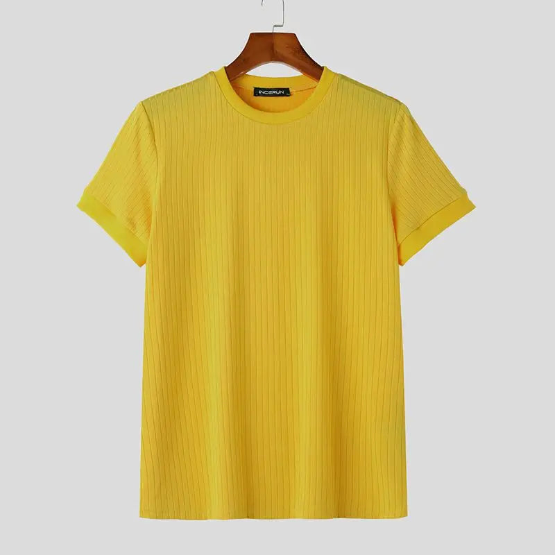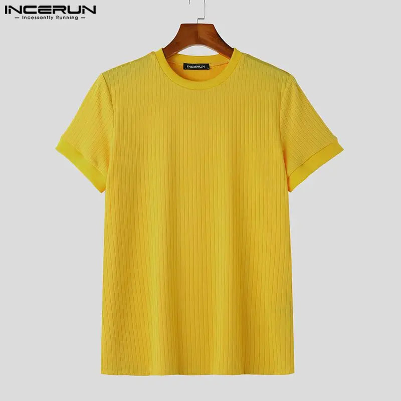 INCERUN Men T Shirt Solid Color Striped O-neck