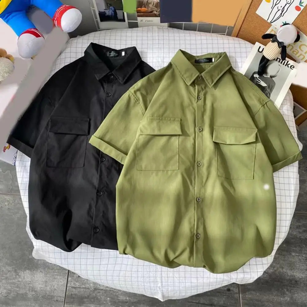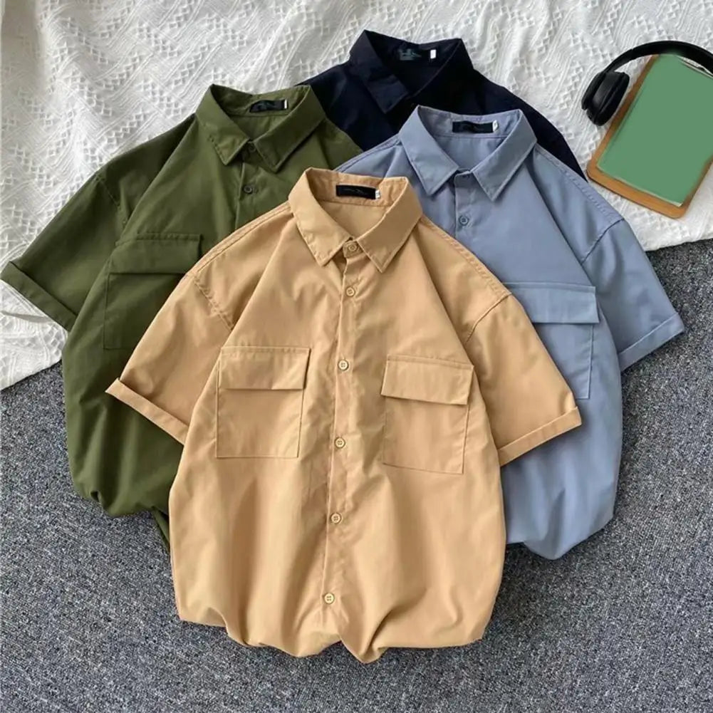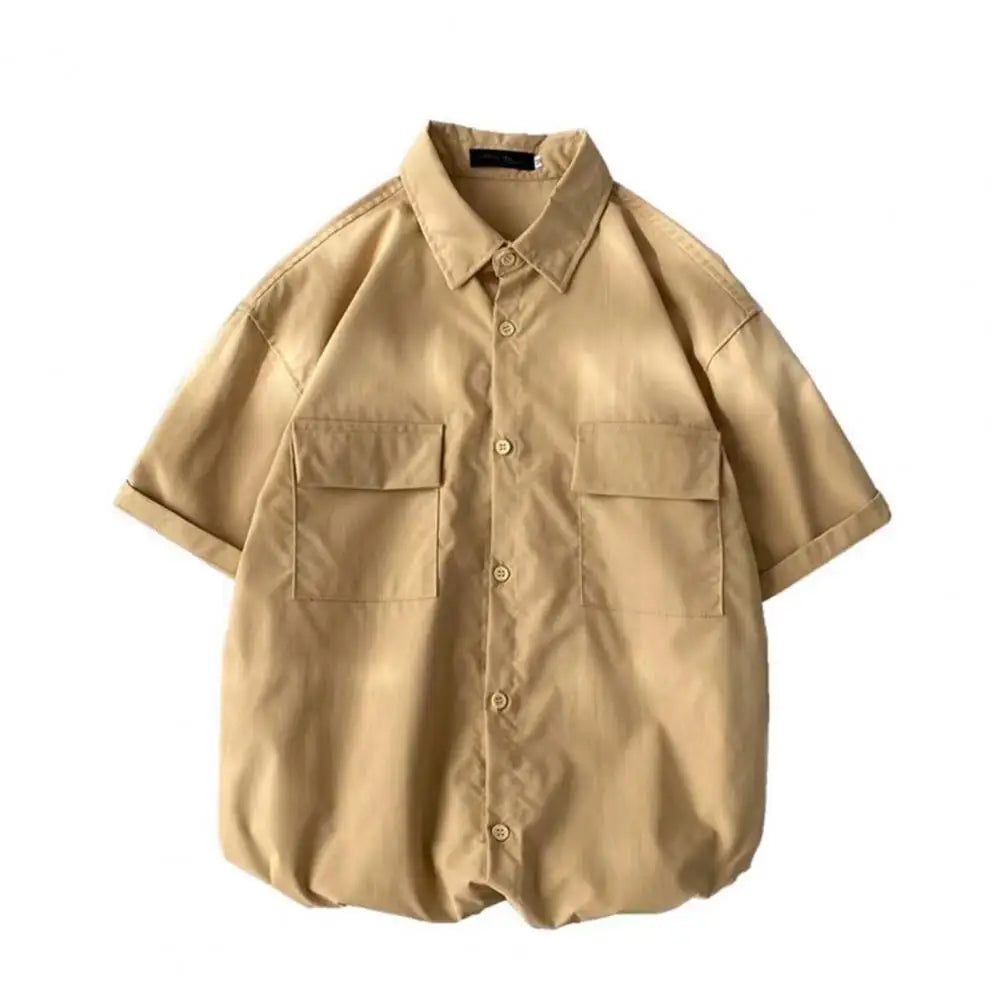 Male Cargo Shirt Lapel Half Sleeve Flap Pockets