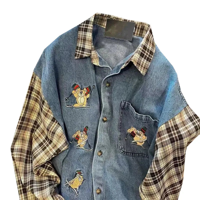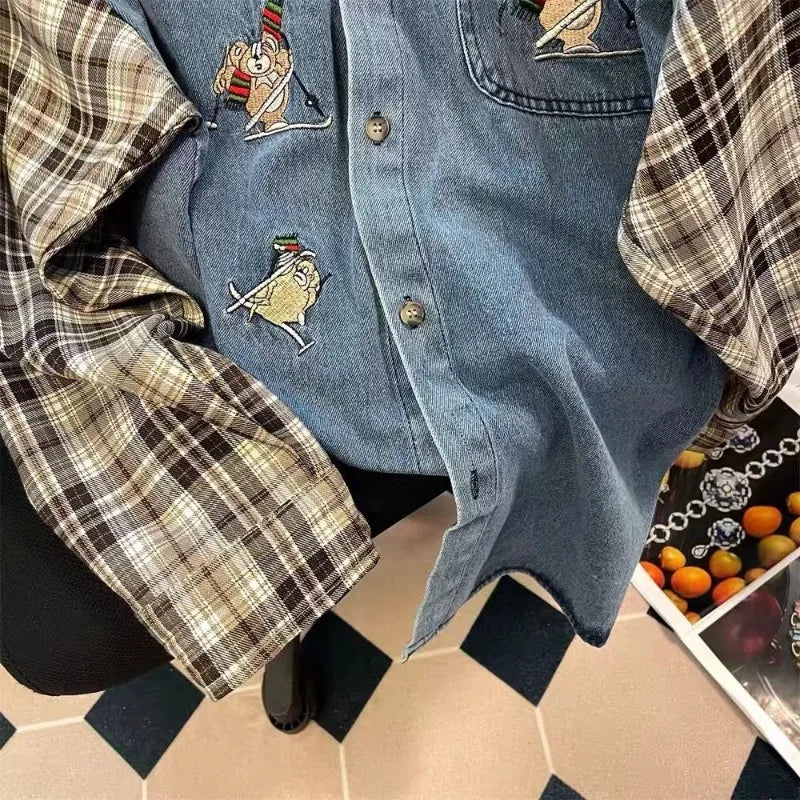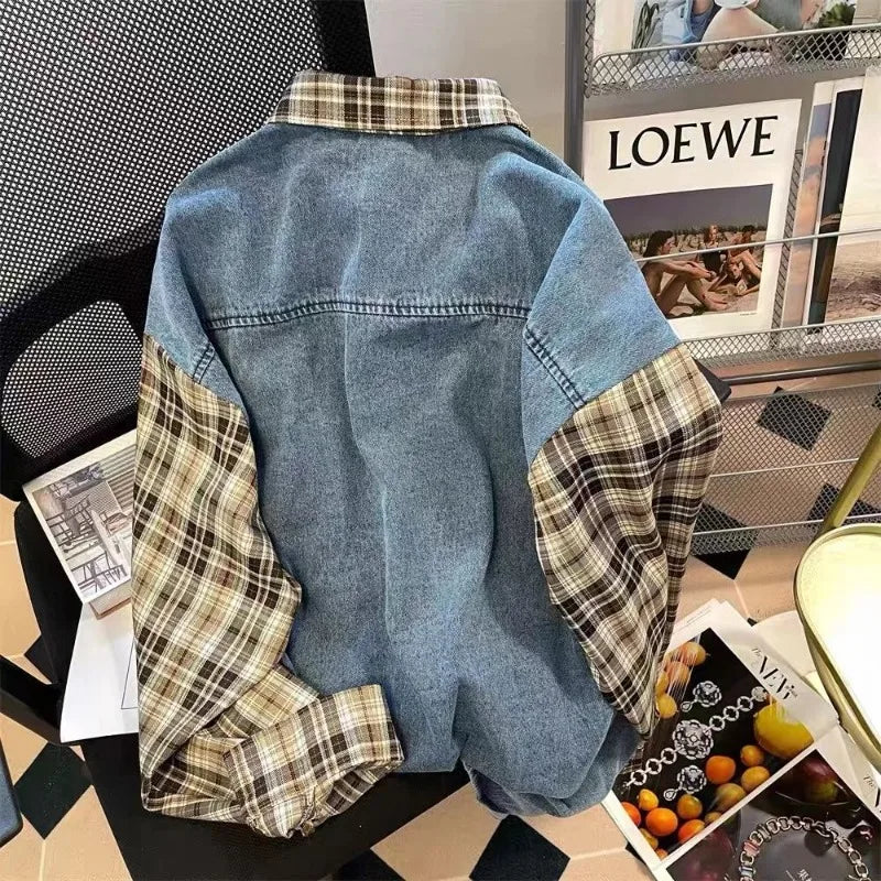 Men's Plaid Stitching Denim Shirt Women's Autumn New