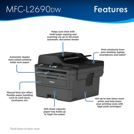 Brother MFC-L2690DW Monochrome Laser All-in-One Printer, Duplex Printing,