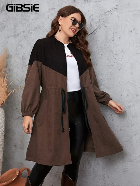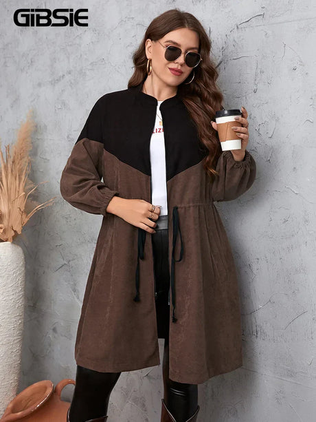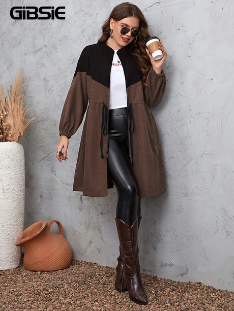 GIBSIE Plus Size Stand Collar Colorblock Corduroy Jacket