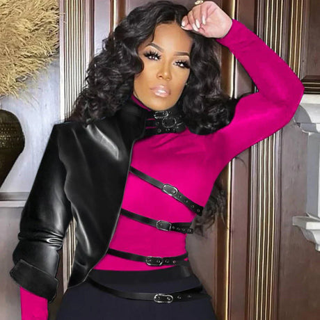 Plus Size PU Leather Teddy Turtleneck Ruffle Asymmetrical