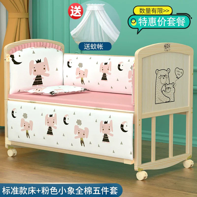 • Assembly | Lined big bed + Pink Bunny crown padded five-piece set (send mosquito net nursing table)