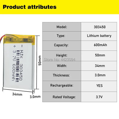 Rechargeable 3.7V 600mAh Battery 303450 Lithium Polymer Li-Po