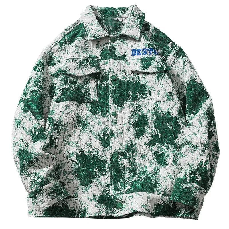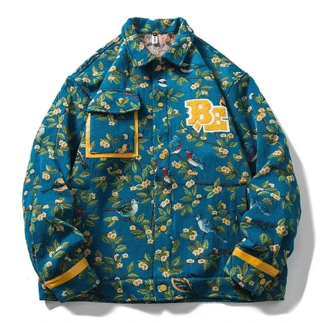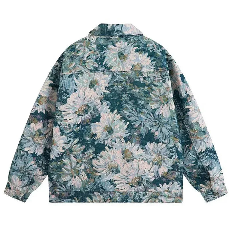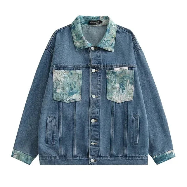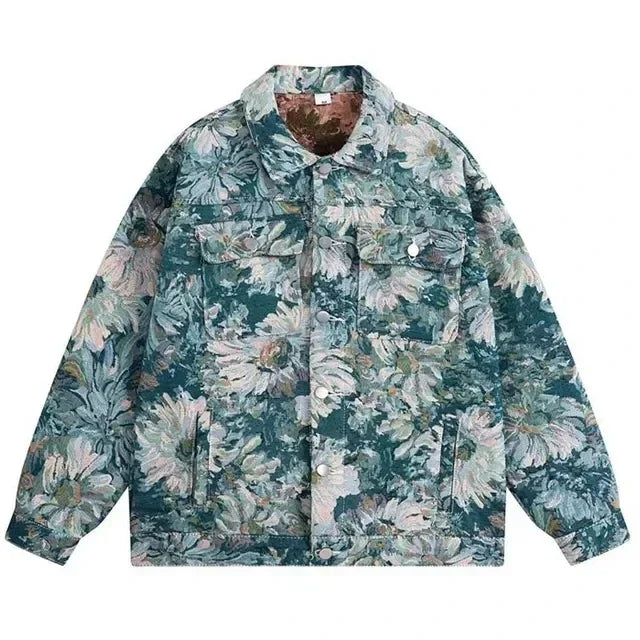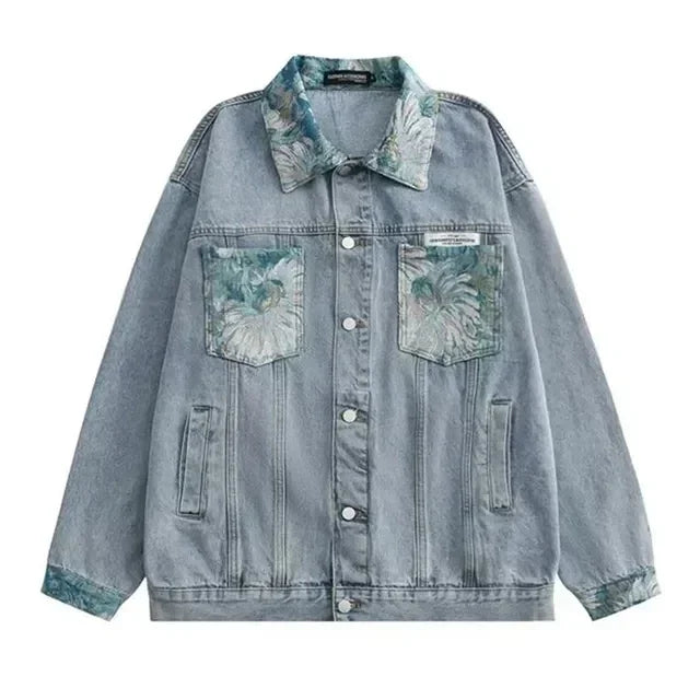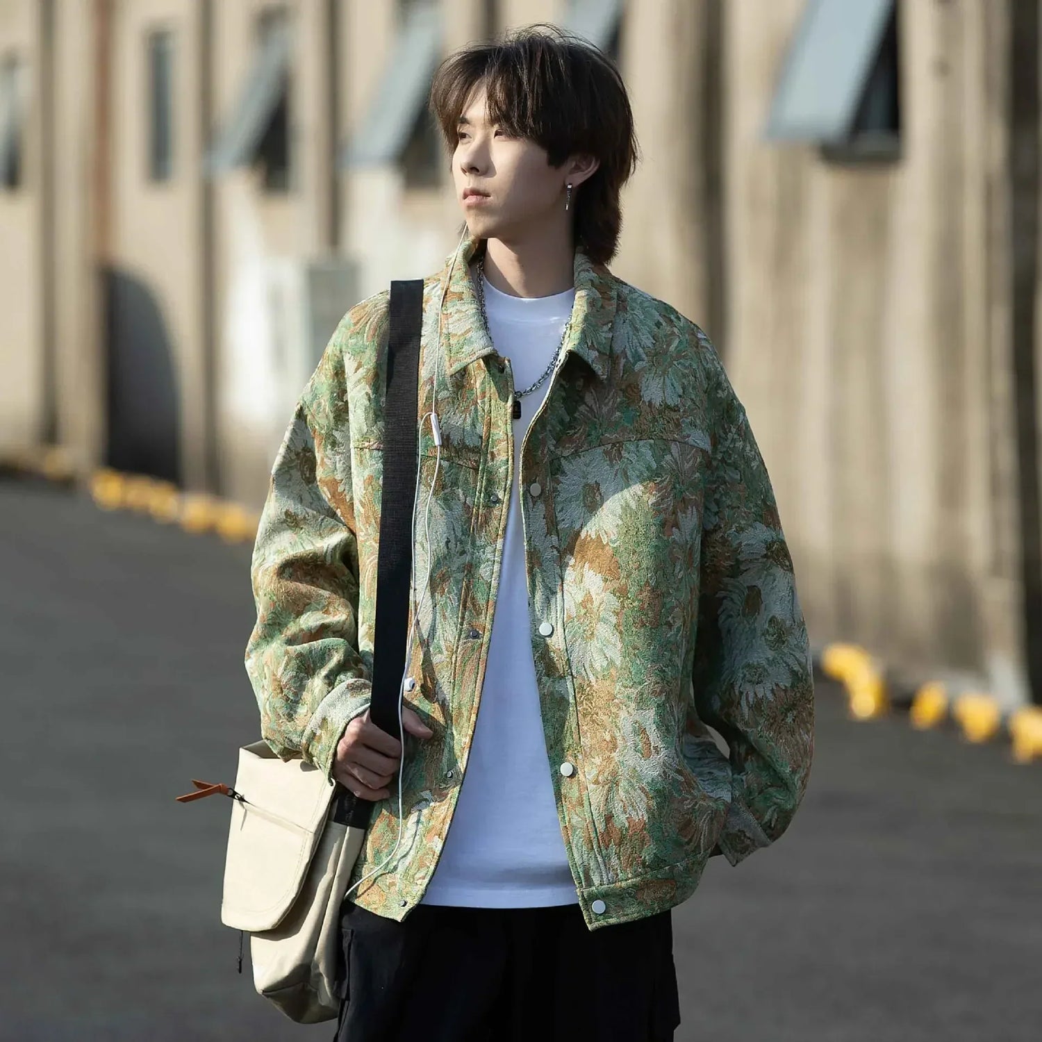 Full Flowers Jacquard Denim Jacket Men Korean Fashion