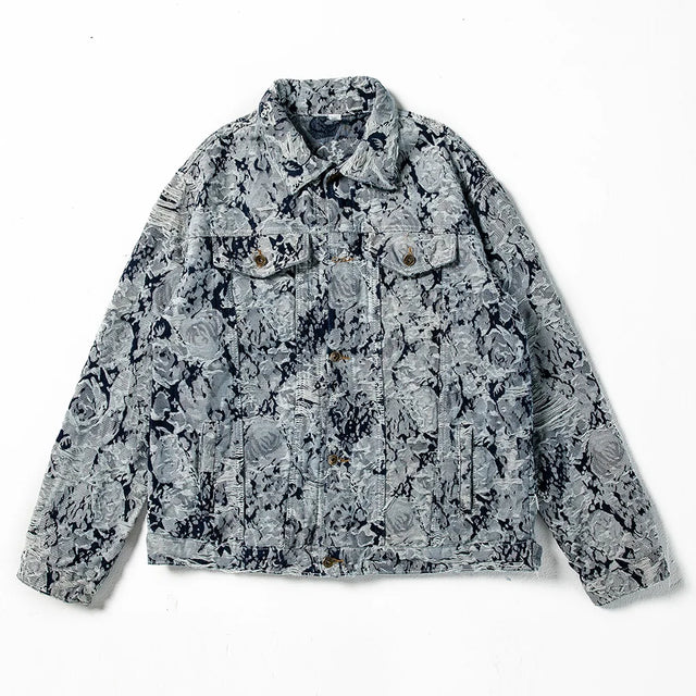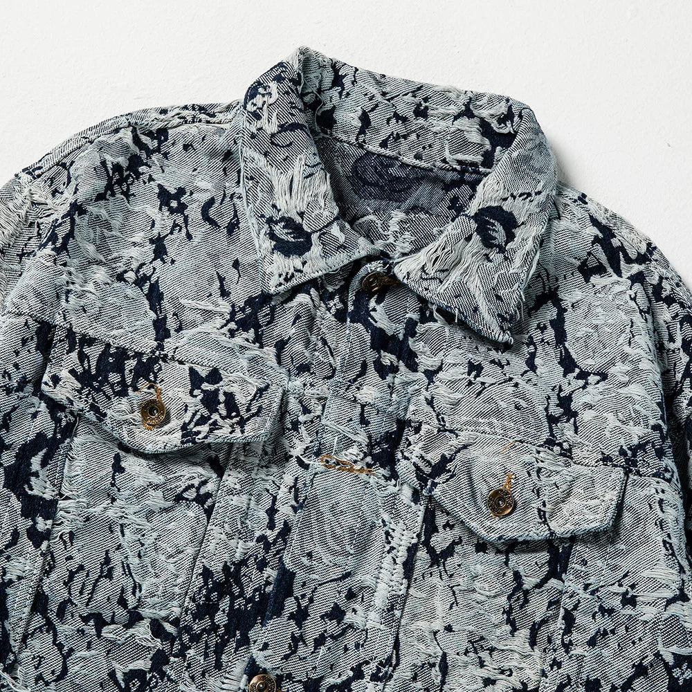 Men Ripped Distressed Denim Jacket Flower Jacquard Weave