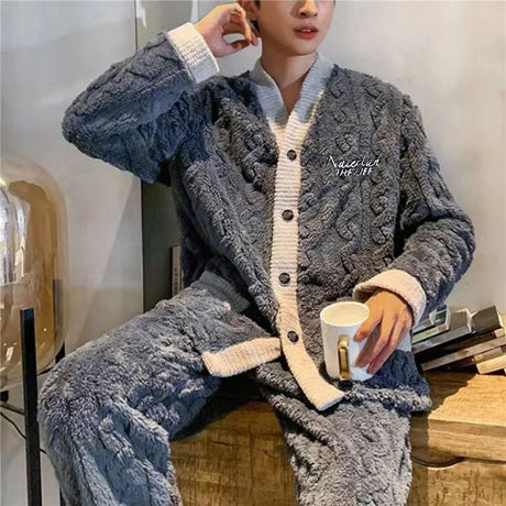 Men Winter Warm Flannel Pajama Set Long Sleeve