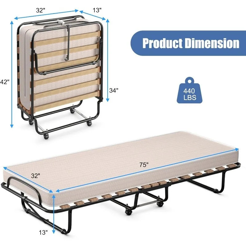 Folding Bed with Mattress, Rollaway Guest Bed w/