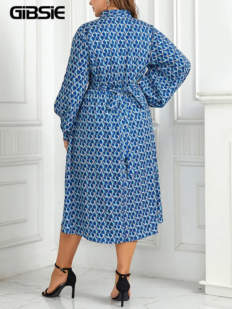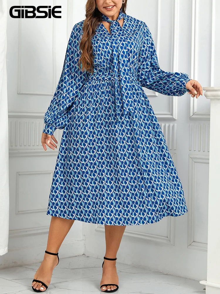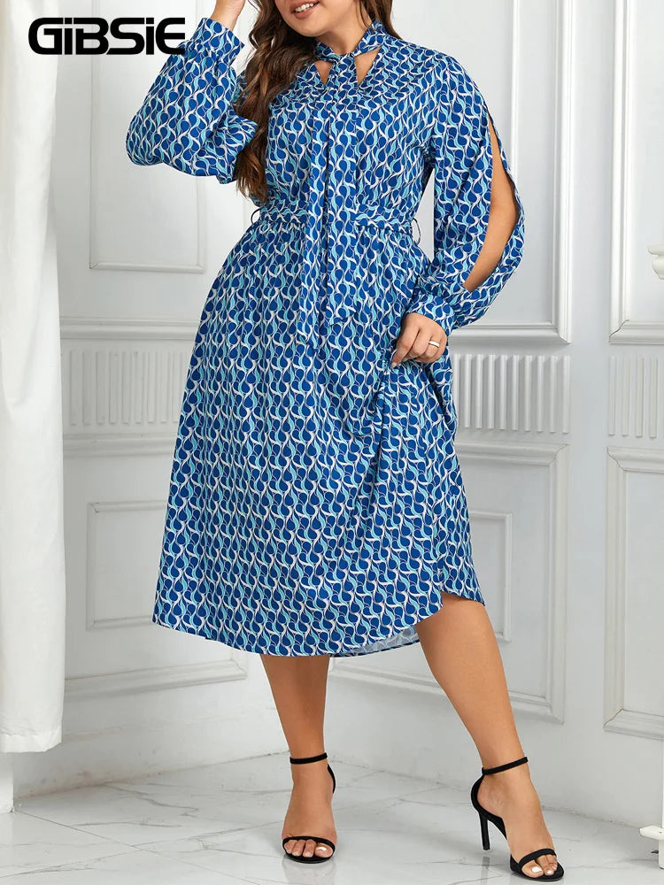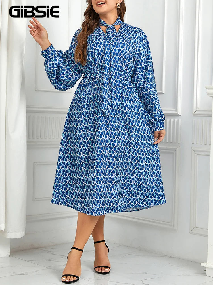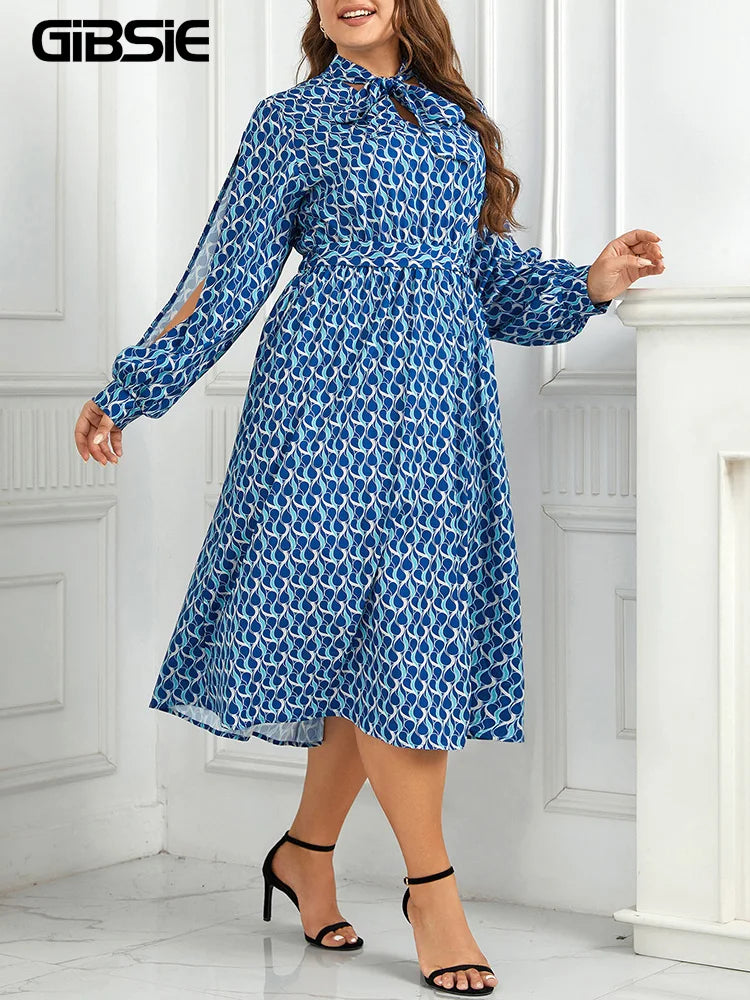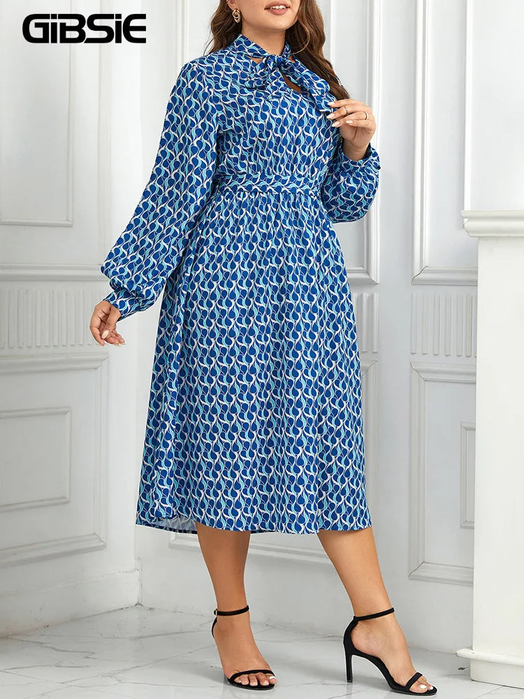 GIBSIE Plus Size Bow Tie Neck Belted Print