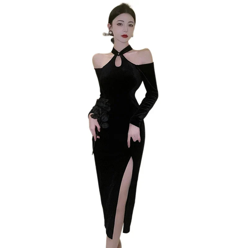 Womens Dress Off Shoulder Slim Sexy Split Cheongsam - black / M / VIP Price is backordered and will ship as soon as it is back in stock.